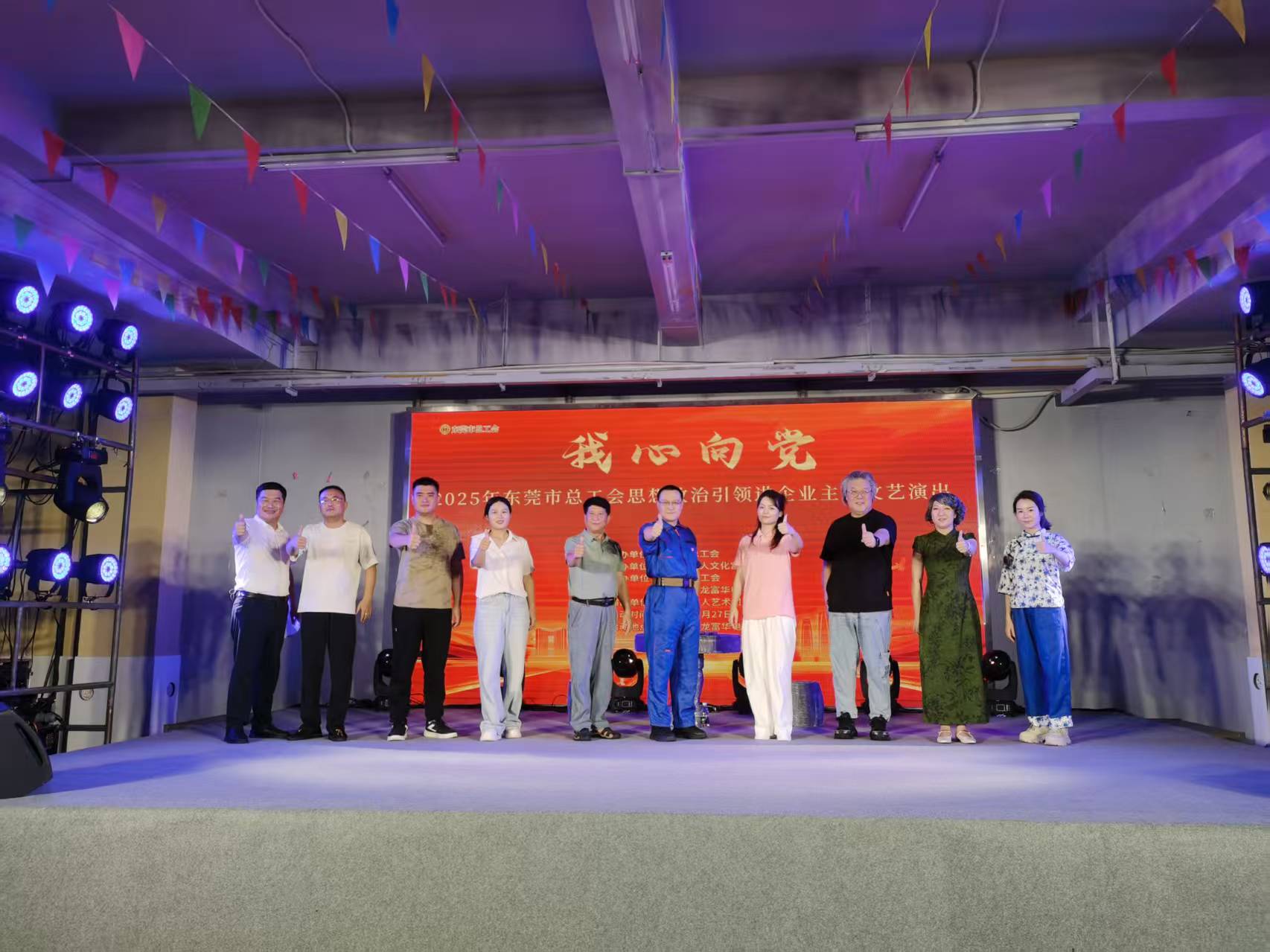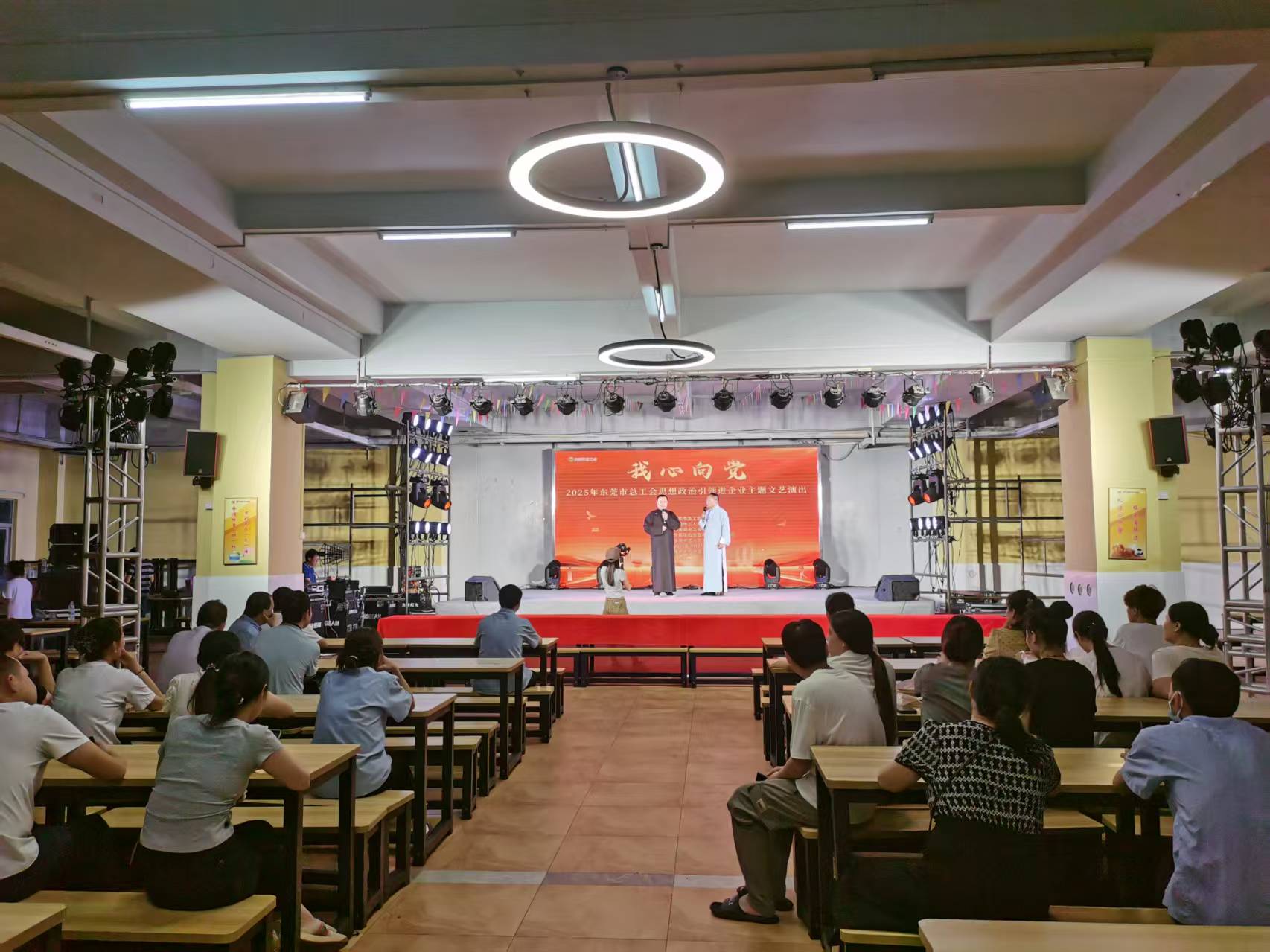 与此同时,食堂区域的舞台上也热闹非凡,总工会精心组织的文艺晚会同步上演。舞台柔和的灯光交织出浓浓的氛围感,歌曲、情景朗诵、小品等节目轮番登场,不少员工在游园间隙驻足观看,有的捧着刚买的小吃边吃边赏,有的跟着旋律轻轻哼唱,舞台上下互动频频,将现场的节日氛围推向又一个高潮。